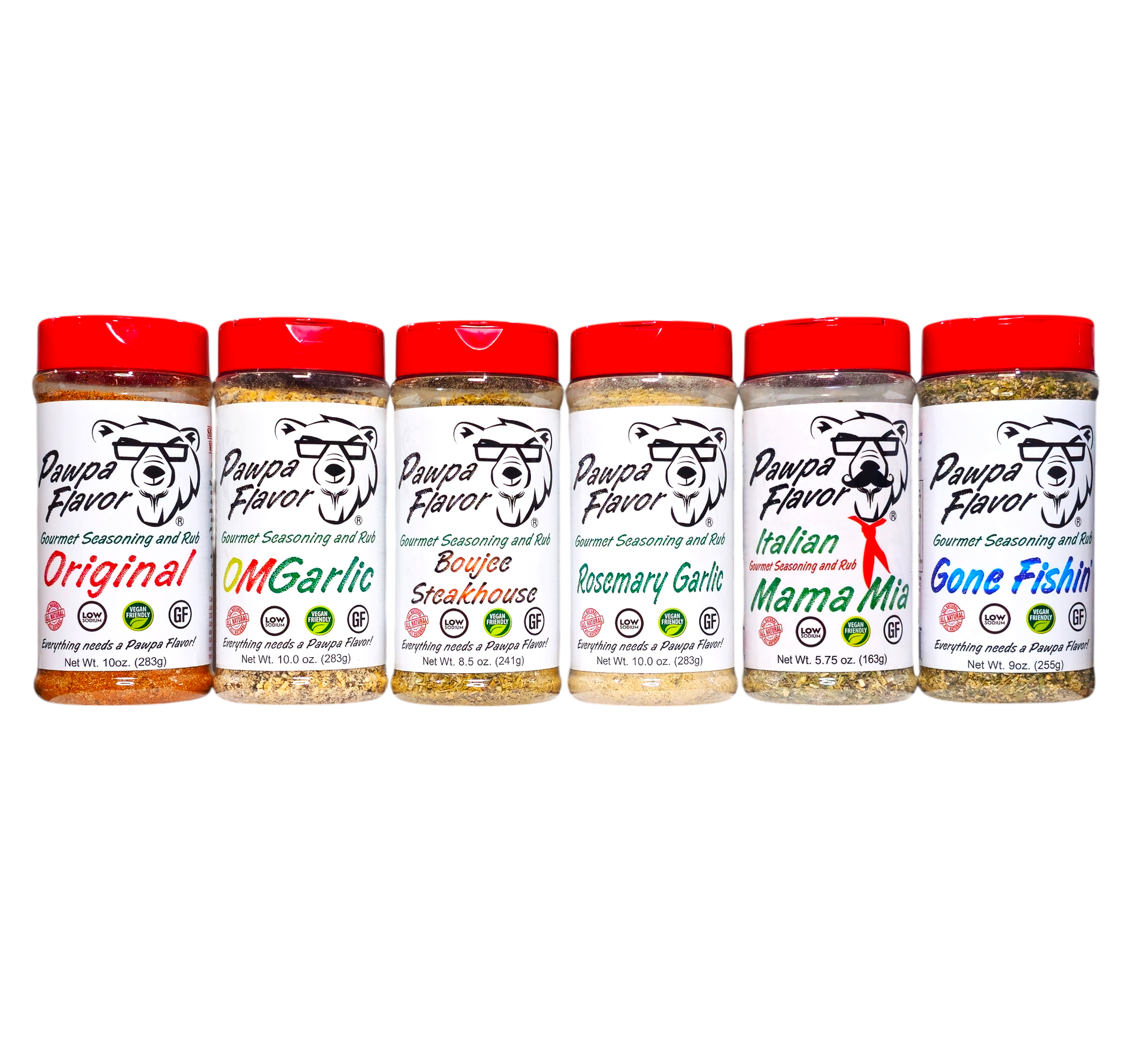 Pawpa Flavor's Ultimate Seasoning Collection – the perfect way to elevate every dish with bold, all-natural flavors. This variety pack features six large bottles of our premium, hand-crafted seasonings, each designed to bring a unique burst of taste to your cooking. And the best part? They're all low sodium, low sugar, gluten-free, and vegan-friendly, so you can savor every bite guilt-free!