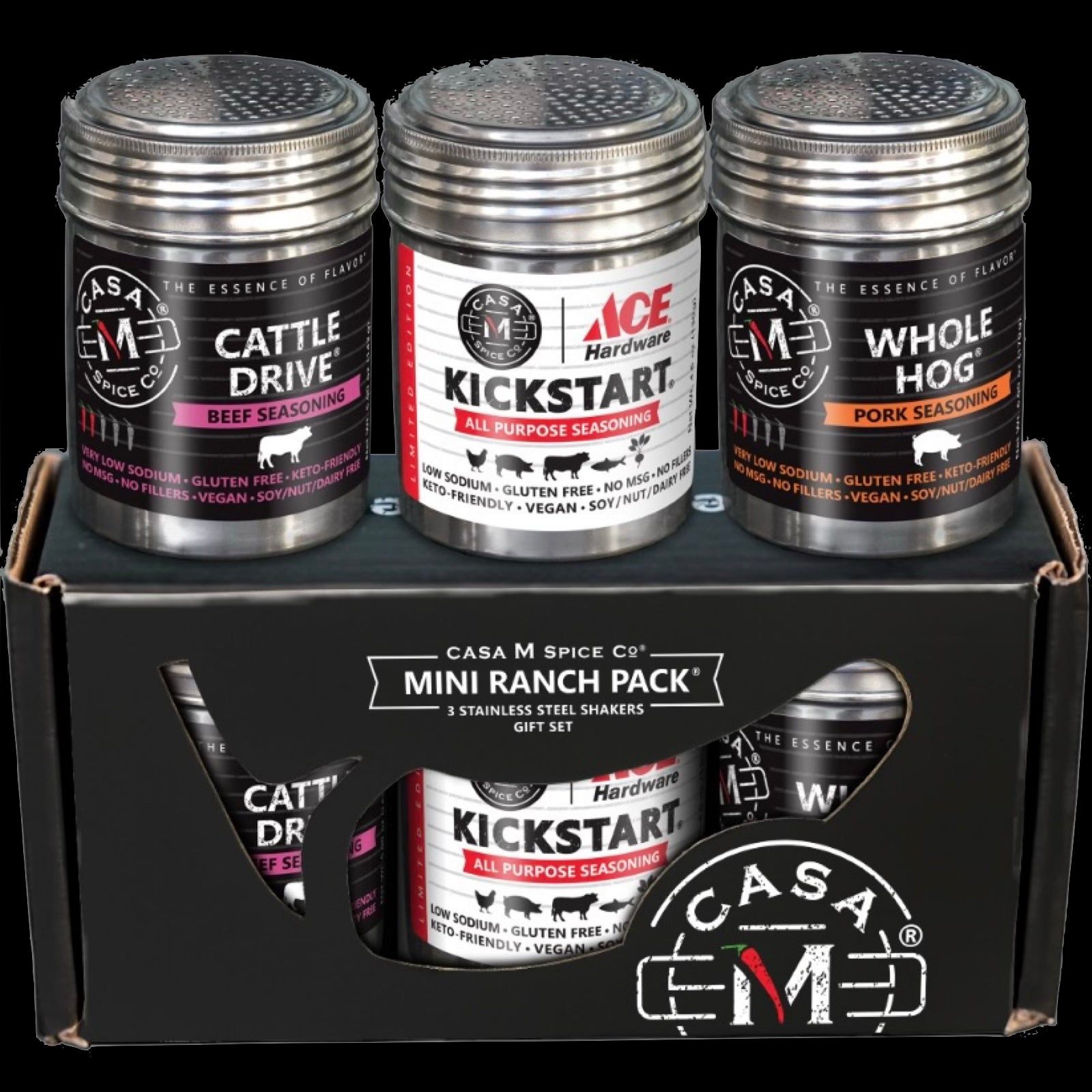 If you are looking for an easy way to get several of Casa M Spice Co®’s delicious spice blends at one great price, try the Mini Ranch Pack®. It comes equipped with three reusable and refillable stainless steel shakers of Cattle Drive®, Free Range® and Whole Hog®, seasonings designed specifically for beef, chicken and pork. Trust us, you will go through these seasonings quickly as you try new flavors and enjoy with your family and friends. It also makes the perfect gift for your favorite chef or grillmaster.