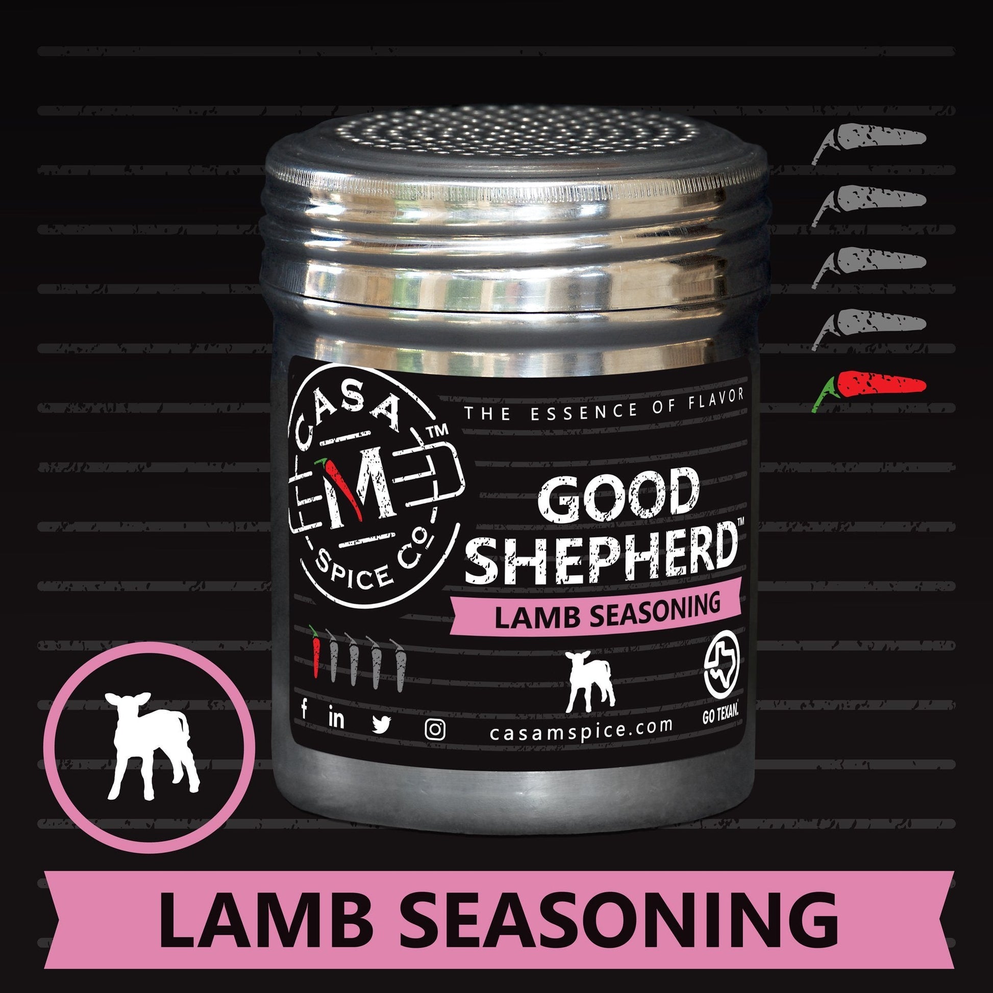 - 4-oz of Casa M Spice Co® Good Shepherd® Seasoning in a stainless shaker
